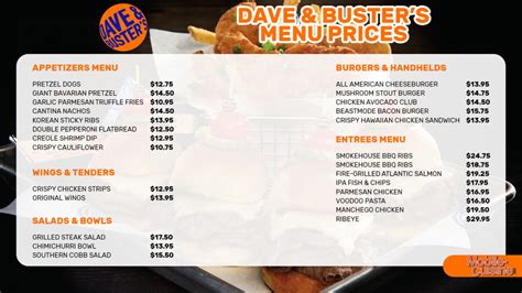 $1 off wine and draft beer. Special fast food items, like. Burgers here at dave and busters can cost you around $1.29 to $11.99.